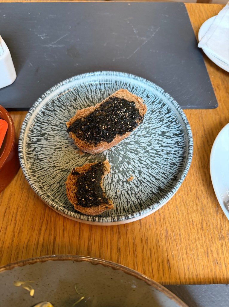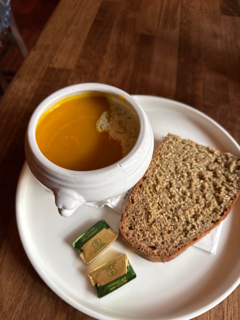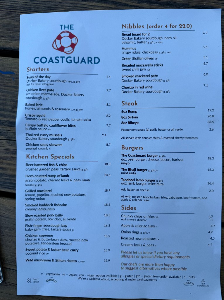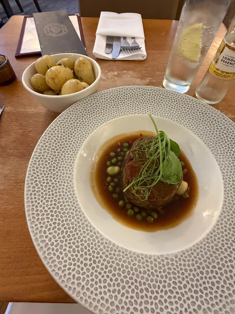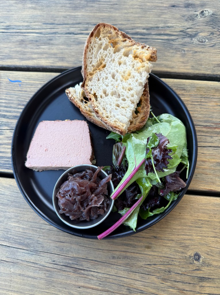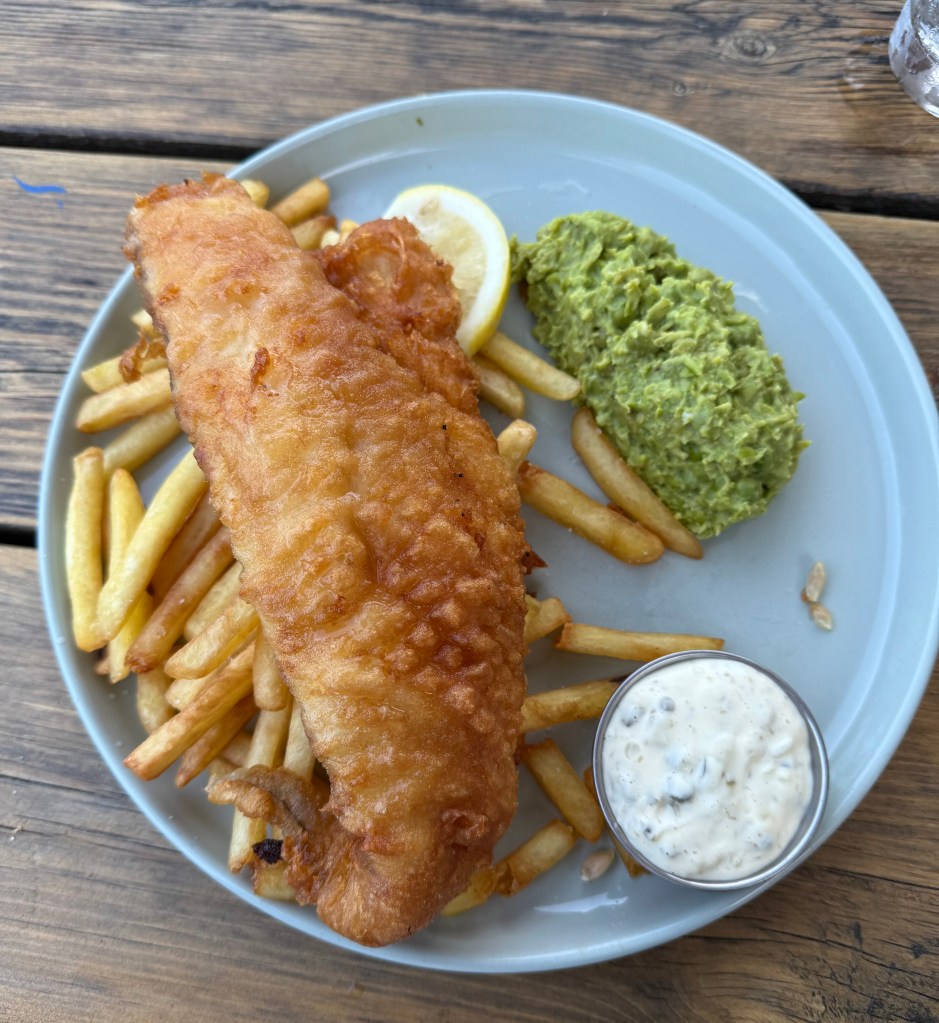 | Chicken liver pate red onion marmalade, Docker Bakery sourdough and Beer battered fish & chips crushed garden peas, tartare sauce with an Elderflower Tonic Water (non-alcoholic). |