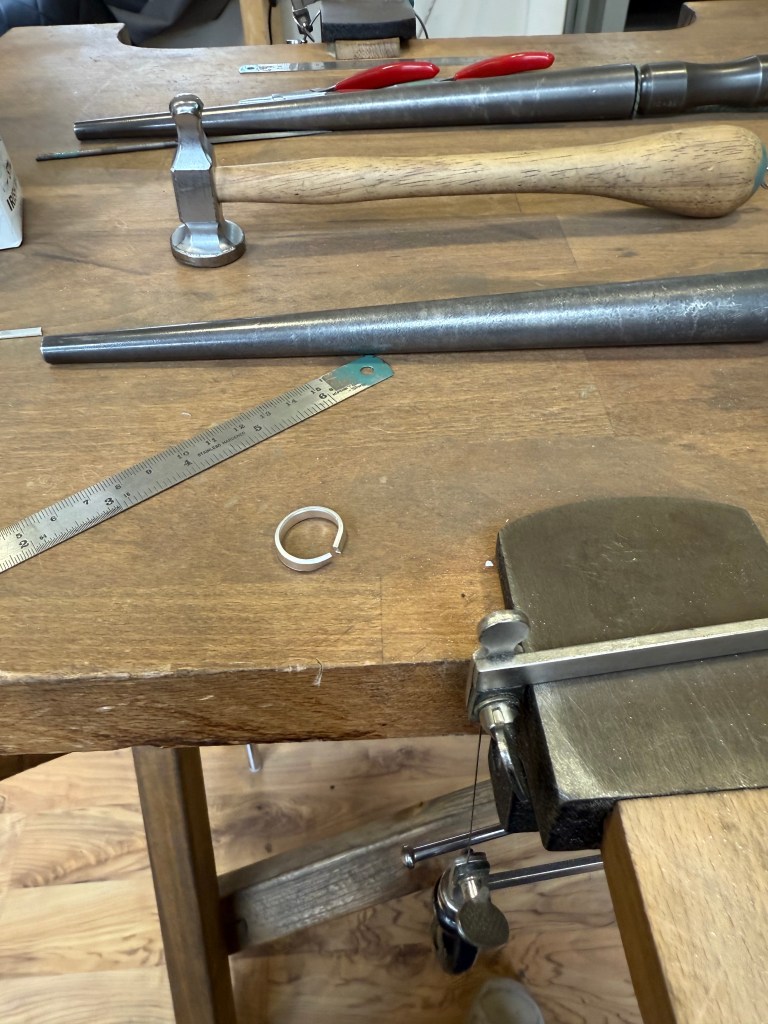 We learned to forge the metal — carefully pounding and shaping it into a ring. Every tap of the hammer had purpose. The silver was annealed, meaning it was heated until it softened, making it pliable again after being hardened by the blows. As we worked, the imperfections began to disappear. And just like that, what once looked rough and ordinary began to shine with new purpose.